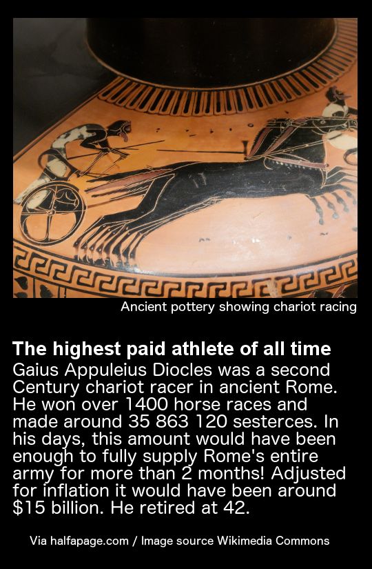 The most famous of all was Gaius Appuleius Diocles who won 1,462 out of 4,257 races. When Diocles retired at the age of 42 after a 24-year career his winnings reportedly totalled 35,863,120 sesterces ($US 15 billion), making him the highest paid sports star in history.